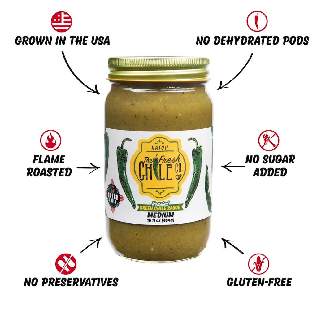 Our Roasted Hatch Green Chile Sauce starts in the fields of Hatch, New Mexico, where it is freshly picked then delivered by the farmer to our roasting facility. It is then flame-roasted and puréed into a sauce ready to eat with your favorite recipes. Enjoy with burritos, enchiladas, & tacos!